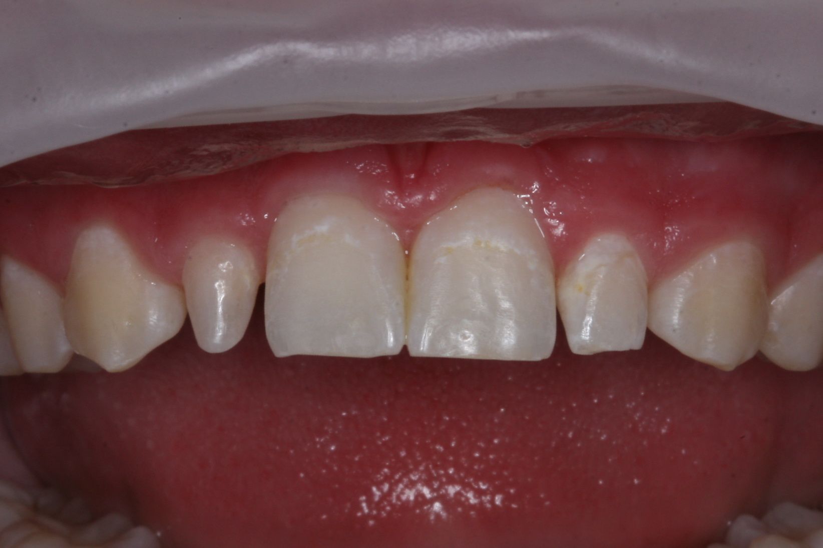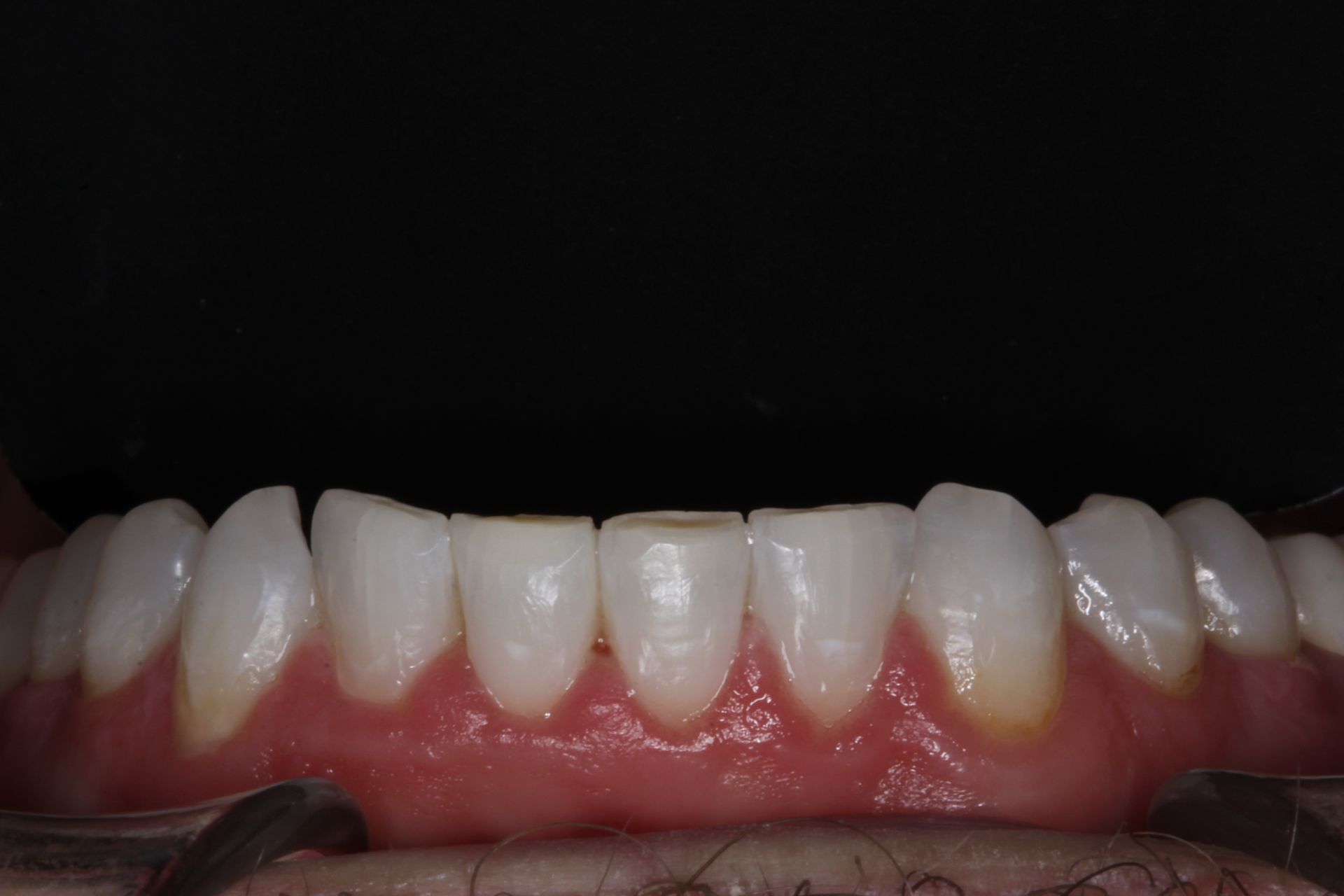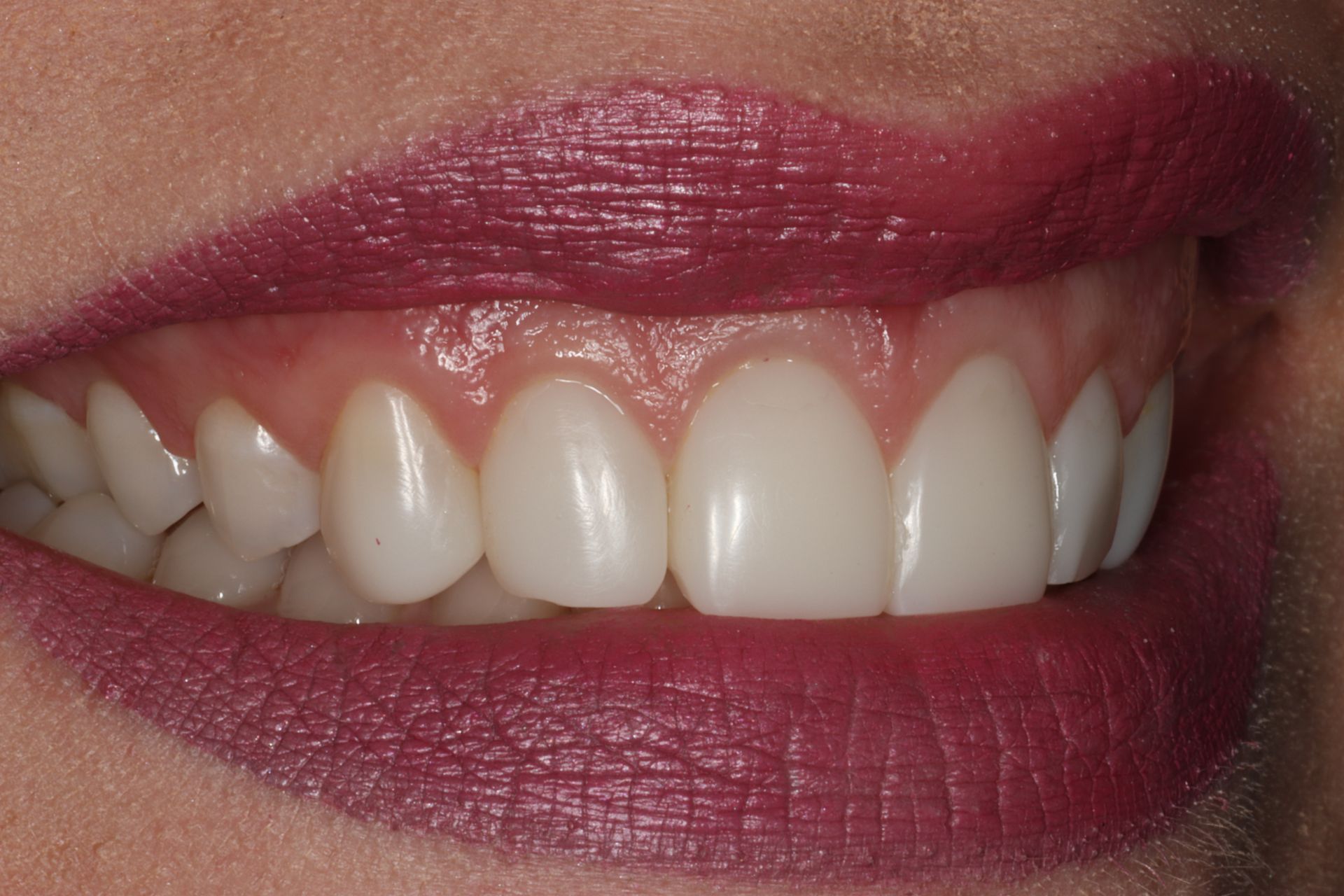 This patient was complaining of sensitivity to cold and notches in her teeth that showed when she smiled and collected food when she ate. Conservative resin bonding was matched to her tooth shade to add back the missing tooth structure and protects against future tooth erosion.